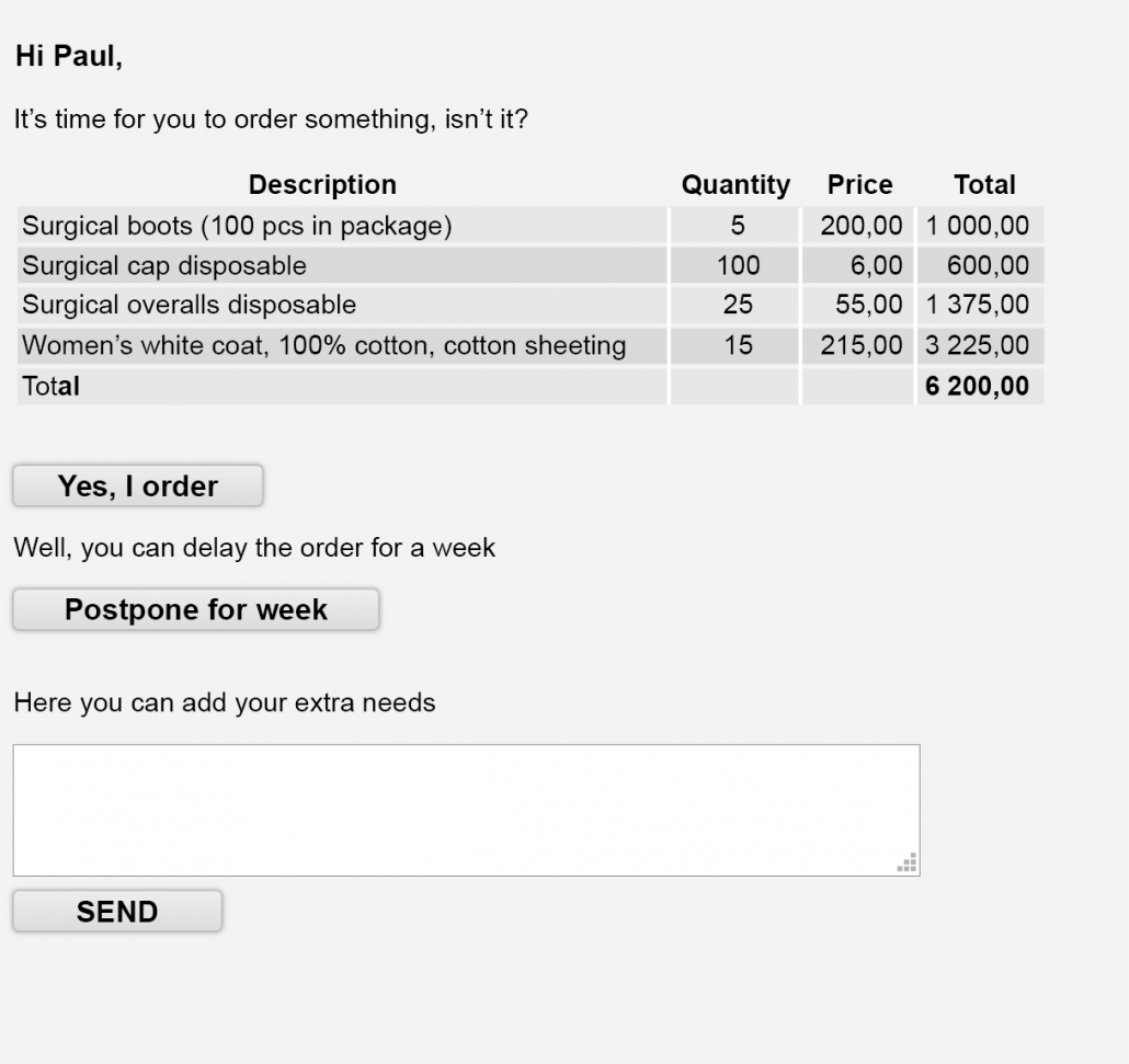 If the Customer agrees with the order, he presses the "Confirm" button. A new order is created, and a letter to call the Customer about the new order is sent to an operator of the online shop. The call generates an additional sale.
